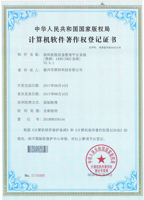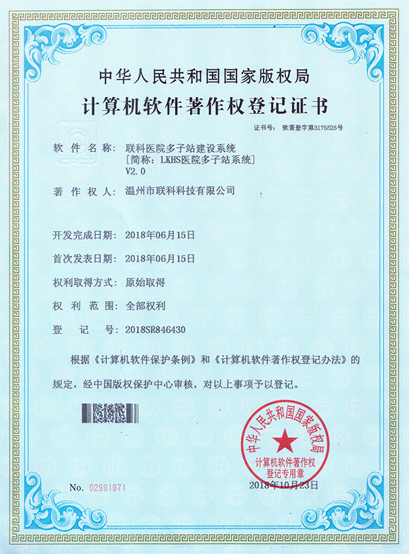 聯科醫院網站集約化管理平臺V1.0登記證書(2022R11L2489282)