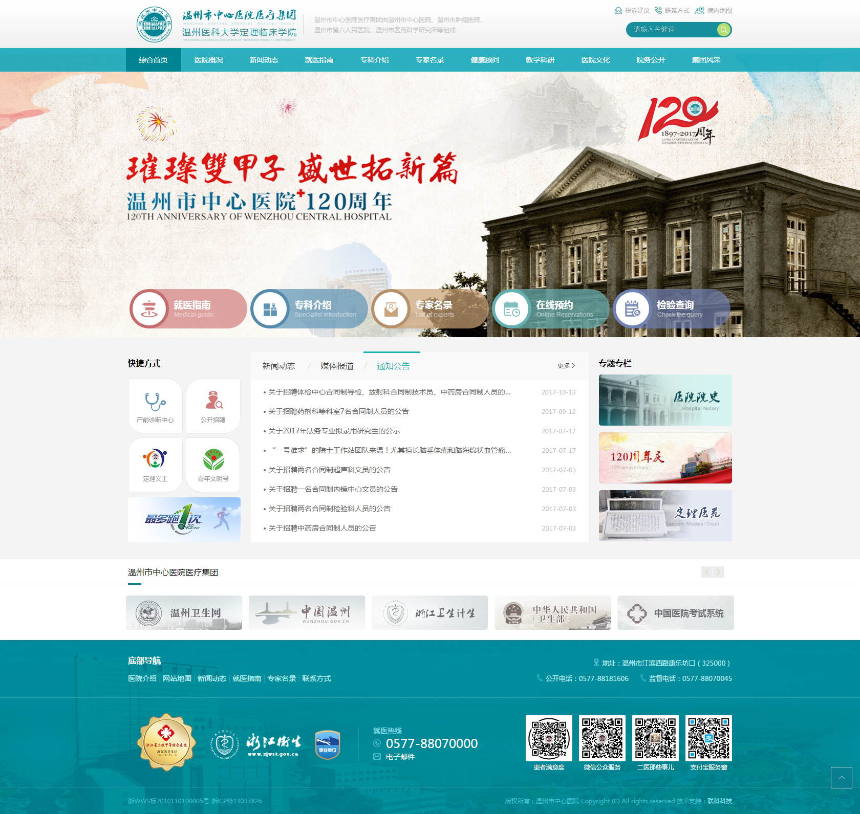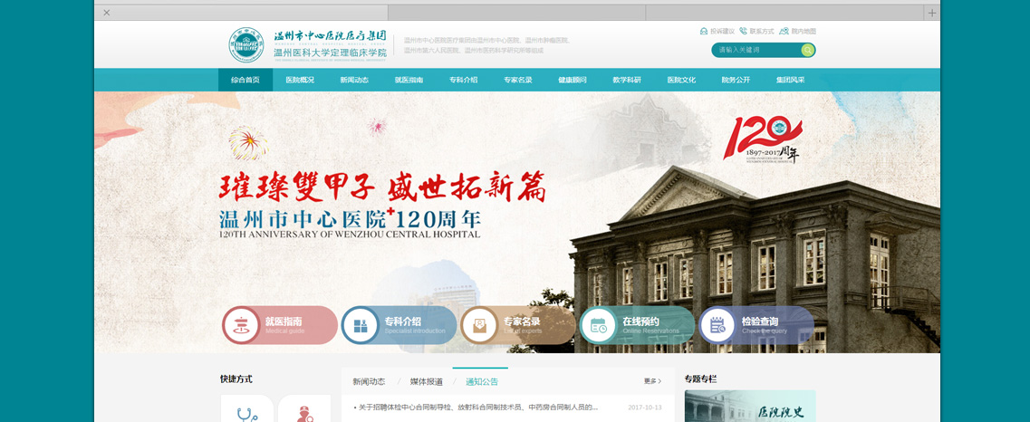 溫州市中心醫(yī)院(溫州市腫瘤醫(yī)院、溫州市醫(yī)藥科學研究所)坐落在美麗的甌江之濱,是一所集醫(yī)療、教學、科研、預防、保健、康復為一體的三級甲等綜合醫(yī)院,是浙江三家百年名院之一。醫(yī)院始建于1897年(清光緒23年),前身是定理醫(yī)院、白累德醫(yī)院、溫州市第二人民醫(yī)院。2002年—2003年,醫(yī)院先后和溫州市醫(yī)藥科學研究所、溫州市第五人民醫(yī)院、溫州市腫瘤醫(yī)院資產(chǎn)重組合并,成為三院一所格局的醫(yī)療集團;2008年成為溫州醫(yī)科大學附屬醫(yī)院——定理臨床學院;2012年晉級三級甲等綜合醫(yī)院,更名為溫州市中心醫(yī)院;2015年成立溫州