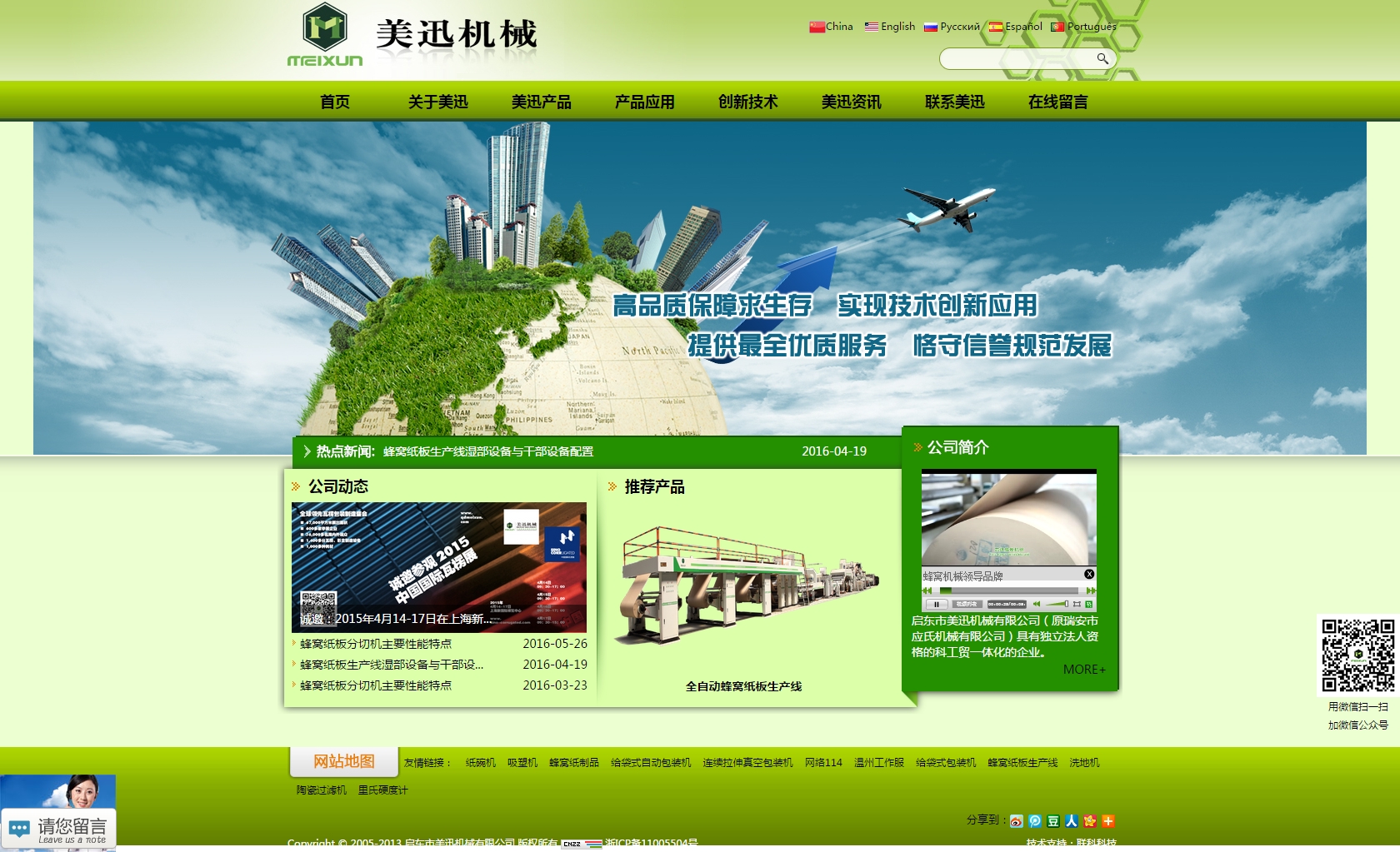 啟東市美迅機械有限公司是中國包裝聯合會成員單位,是一家專業從事蜂窩紙芯、蜂窩紙板成套生產設備研發、制造、銷售的廠家。公司是國內較早制造全自動蜂窩紙板連續生產線的企業,從浙江(原瑞安市應氏機械)建廠到現在的啟東市美迅機械,公司經歷了14載春秋,不斷發展壯大。