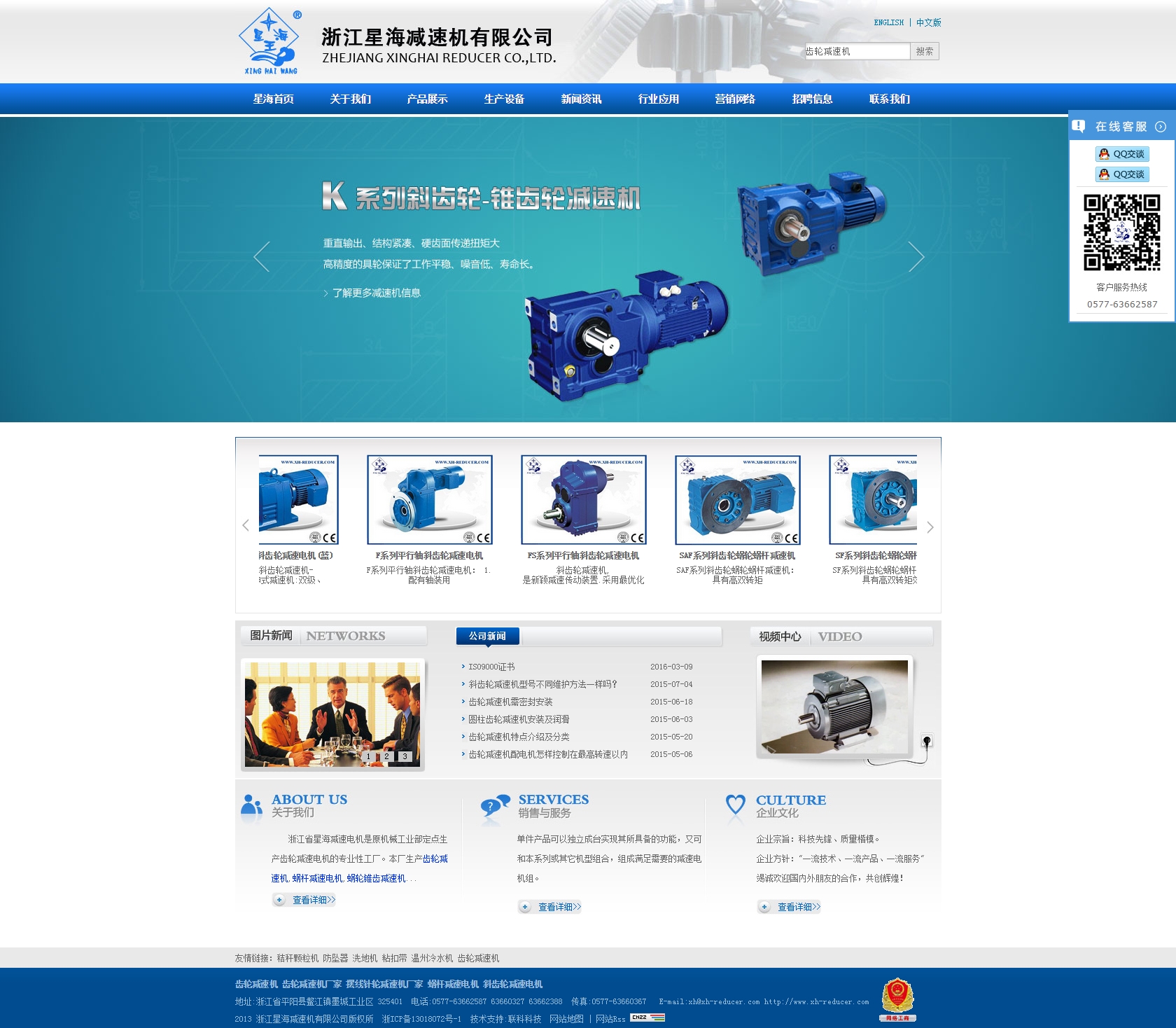 浙江星海減速機有限公司是原機械工業部定點生產齒輪減速電機的專業性工廠,公司通過了ISO9001:2008質量體系認證,國家高新技術企業,浙江省科技型企業,溫州市高成長型企業,平陽縣專利示范企業和溫州市知名商標。本廠生產R系列斜齒輪減速電機(齒輪減速機),S系列斜齒輪—蝸輪減速電機(蝸輪減速機),F系列平行軸斜齒輪減速電機,K系列斜齒輪—錐齒輪減速電機,擺線針輪減速機,T系列螺旋錐齒輪轉向箱,H、B系列標準工業齒輪箱,蝸輪絲桿升降機,RV系列蝸輪蝸桿減速機,ZDY、ZLY、ZSY硬齒輪圓柱齒輪減速機,DBY、DCY硬齒面圓錐圓柱齒輪減速機,ZD、ZL、ZS、ZQ圓柱齒輪減速機等數千種規格的產品,是目前國際上工業動力傳輸領域最普遍采用的減速驅動裝置。