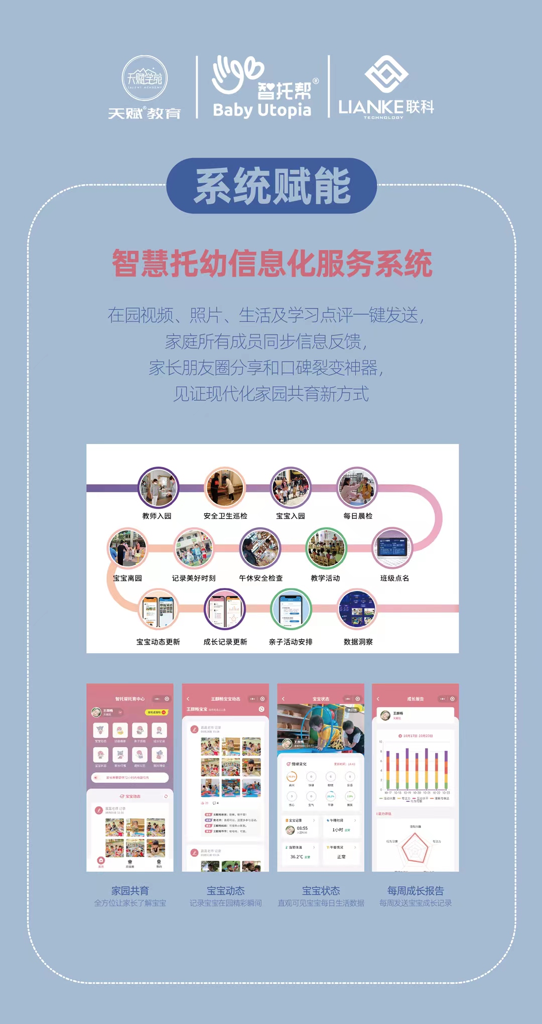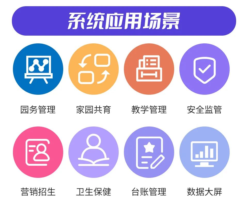本系統充分利用互聯網、大數據、物聯網、人工智能、智能硬件等技術,將智能硬件設備與多元化軟件模塊深度結合,既為托育園、幼兒園各項管理工作提供便捷的工具輔助,又實現了數據的伴隨式采集和實時應用。系統結合嬰幼兒照護服務實際,提升園所保教服務質量和安全保障,基于園所數字化運營需要,實現園務管理、家園共育、教學管理、營銷招生、智慧監管、衛生保健、臺賬管理等功能。