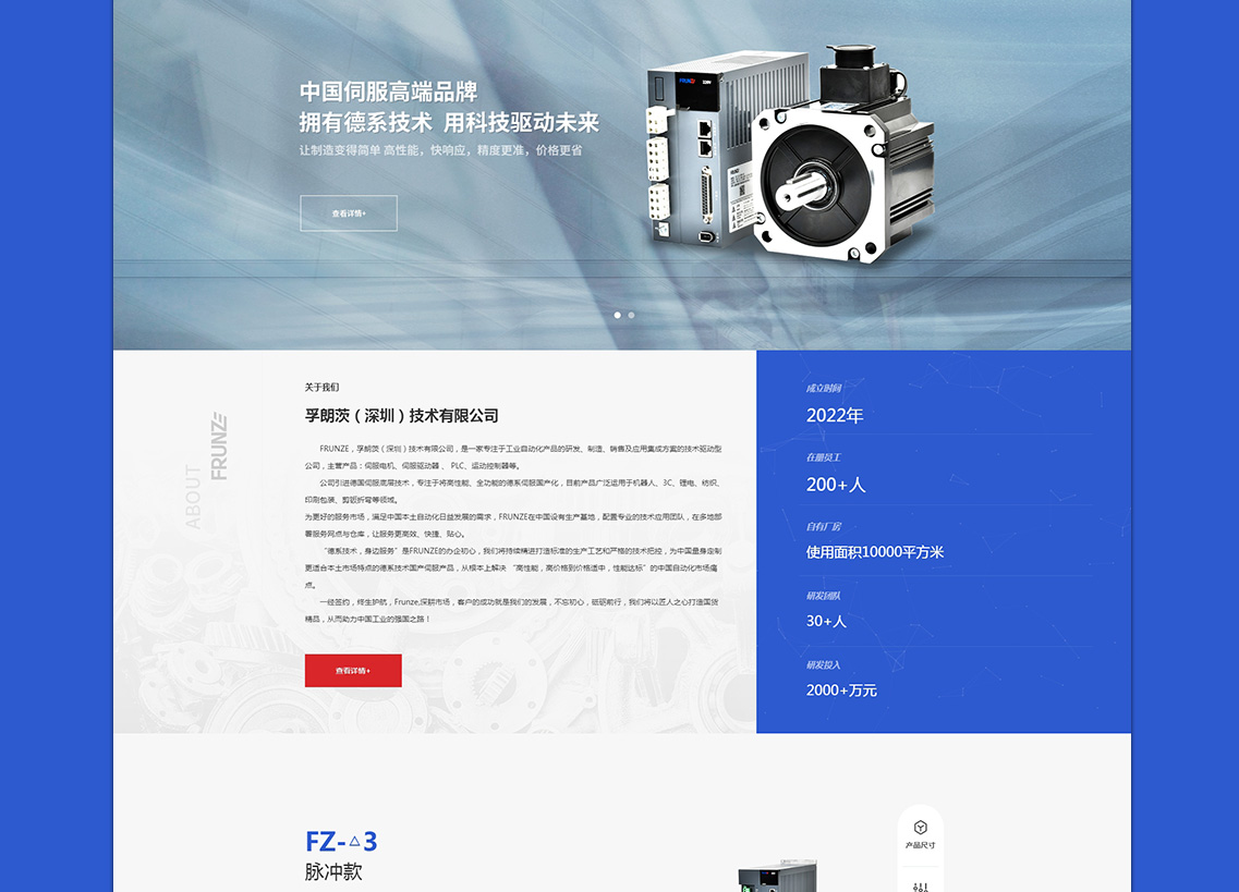 FRUNZE,孚朗茨(深圳)技術(shù)有限公司,是一家專注于工業(yè)自動化產(chǎn)品的研發(fā)、制造、銷售及應(yīng)用集成方案的技術(shù)驅(qū)動型公司,主營產(chǎn)品:伺服電機、伺服驅(qū)動器 、 PLC、運動控制器等。公司引進(jìn)德國伺服底層技術(shù),專注于將高性能、全功能的德系伺服國產(chǎn)化,目前產(chǎn)品廣泛運用于機器人、3C、鋰電、紡織、印刷包裝、剪鈑折彎等領(lǐng)域。