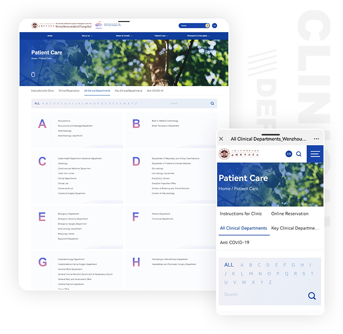 創(chuàng)新設(shè)計(jì)的臨場(chǎng)科室頁面,能讓用戶更方便地查看科室所屬和直接根據(jù)首字母查找,配以關(guān)鍵詞搜索,讓用戶更快速地找到所需的對(duì)應(yīng)科室。