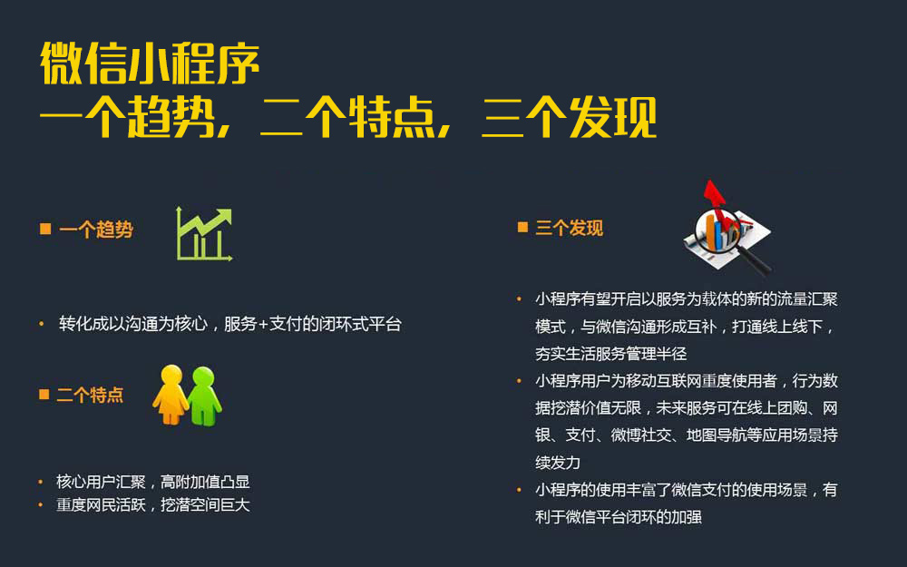 騰訊官方是這樣說的:微信之所以推出小程序,并非想要做應(yīng)用分發(fā)市場,而是給一些優(yōu)質(zhì)服務(wù)商提供一個開放的平臺。